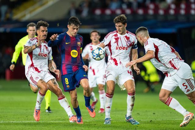 10月21日,巴塞罗那队球员佩德里(左二)在比赛中进攻。 当日,在2025-2026赛季欧冠联赛阶段第三轮比赛中,西甲巴塞罗那队主场6比1战胜希腊奥林匹亚科斯队。 新华社发(胡安·戈萨摄)